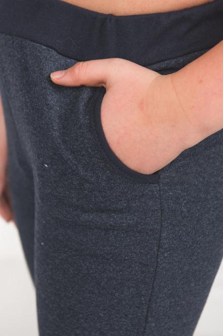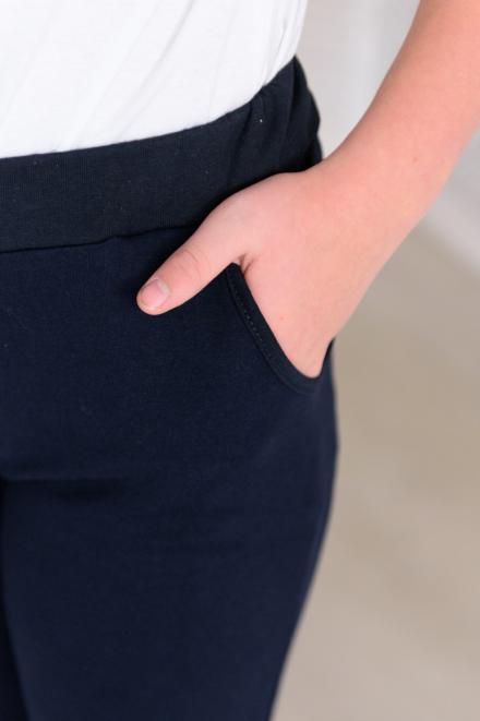 Брюки спортивного фасона мы шьем из футера – материала с гладкой лицевой поверхностью и с мягким начесом на изнанке. Эта трикотажная материя создается на основе хлопка, но может быть с добавлением лайкры или полиэстера. Смесовый характер ткани улучшает ее свойства: повышает эластичность и износоустойчивость, что важно для подростковой одежды. Цветовая гамма здесь тоже сдержанная и практичная – антрацит, индиго, темно-синий и серый. Они сочетаются практически с любой футболкой или толстовкой, на них незаметны загрязнения.