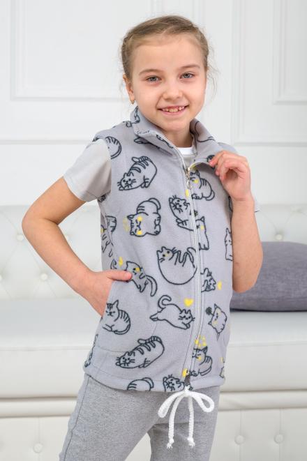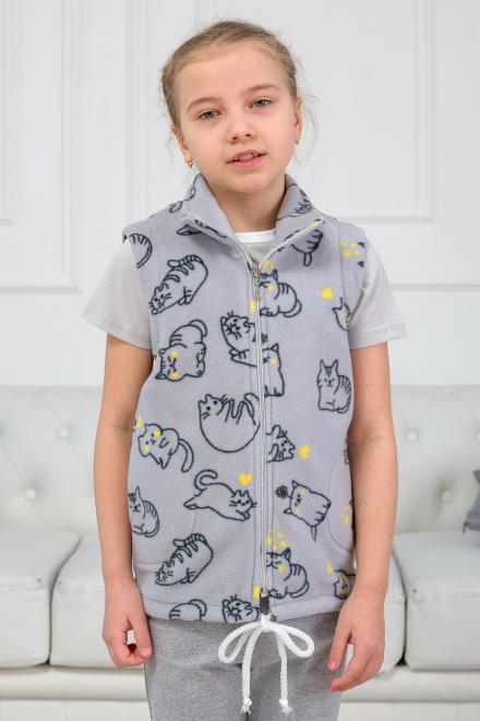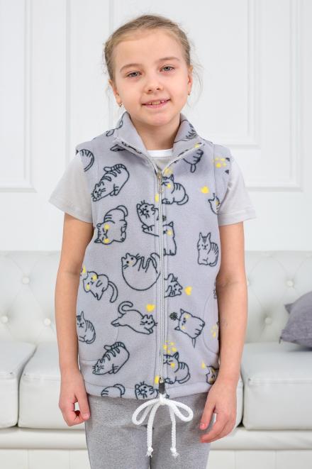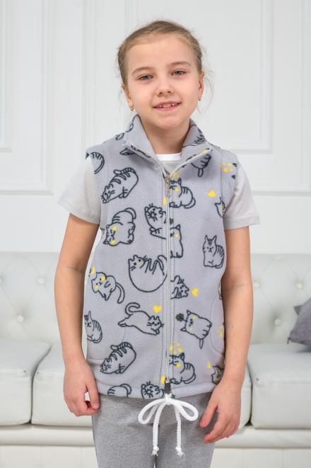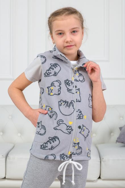 Флисовый жилет «Котик» отлично согревает, поэтому будет в самый раз для прохладной погоды. Дизайн модели достаточно лаконичен и выполнен в приятном оттенке серого. Веселый шуточный принт с вкраплениями желтого оживляет вид и добавляет игривости. Такая вещь точно понравится вашему ребенку.