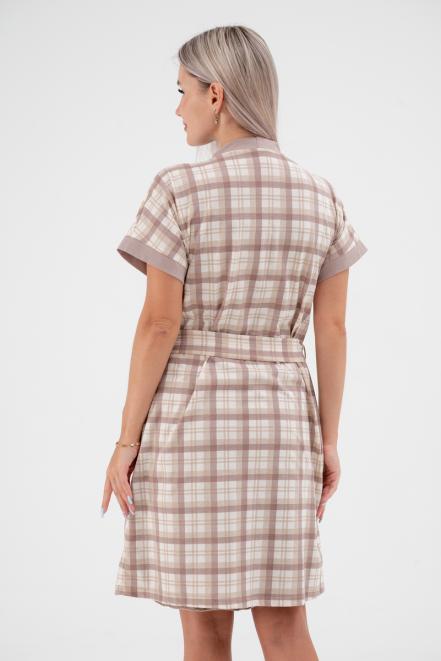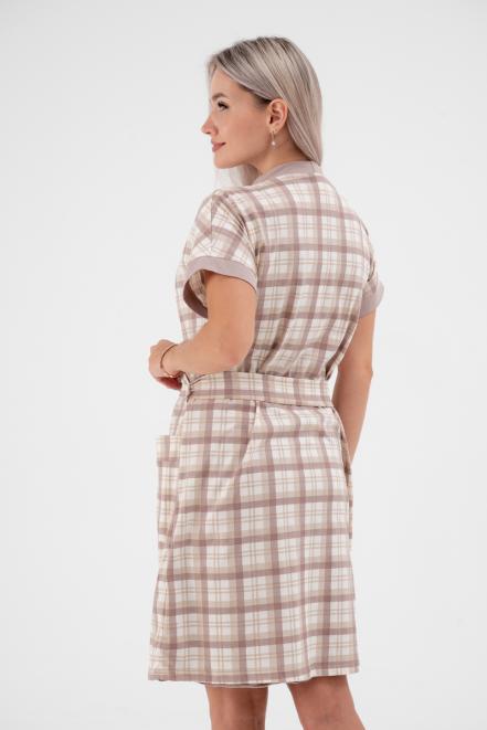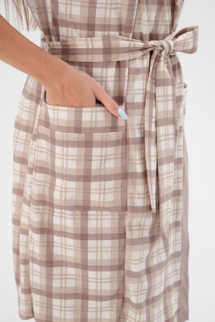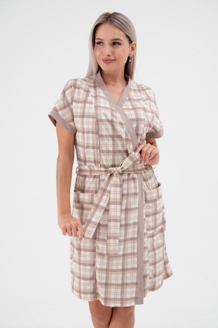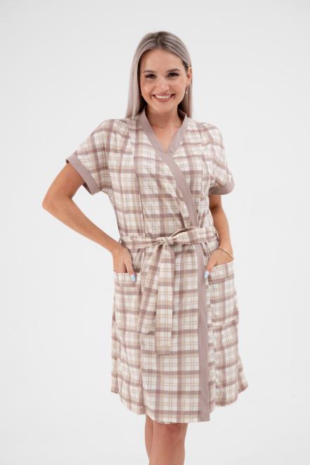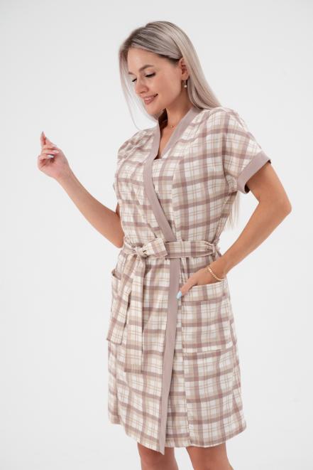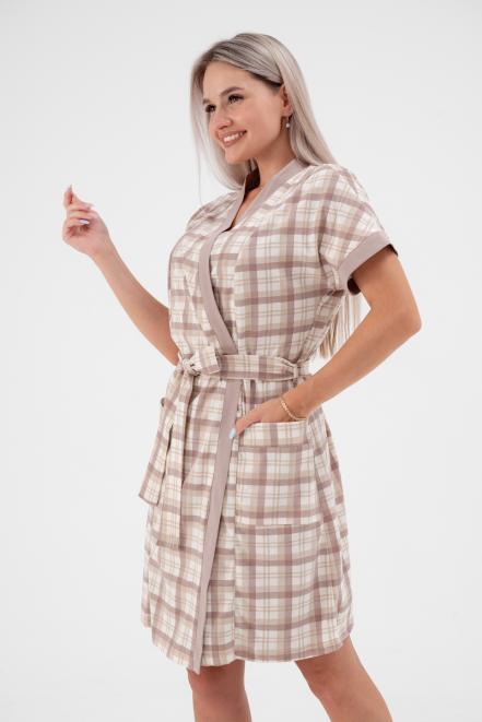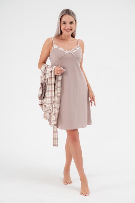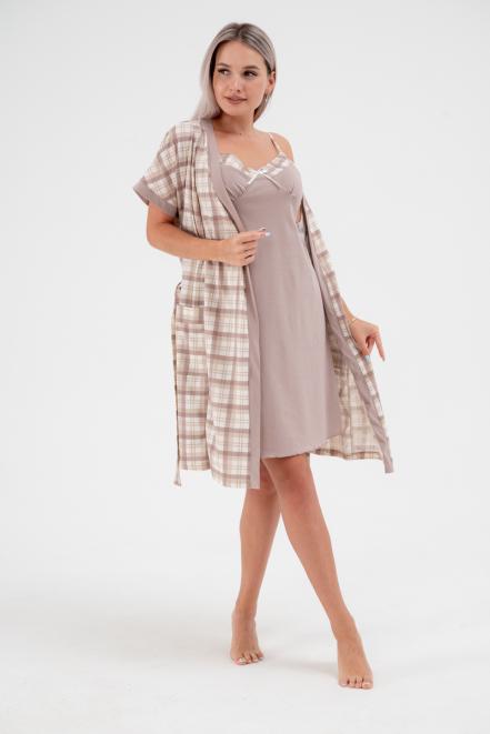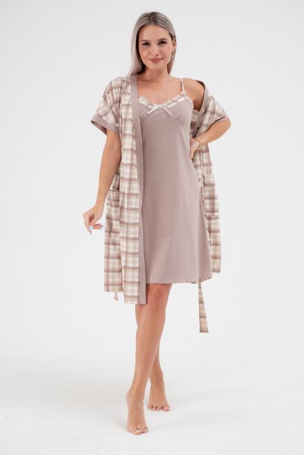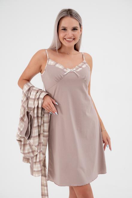 Пижама женская из пеньюара и сорочки из кулирки Эльза клетка какао