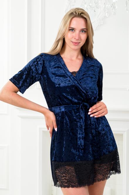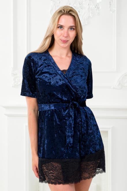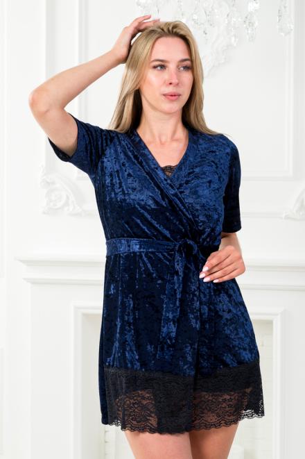 Пижама женская из пеньюара, топа и шорт из бархата Интрига тёмно-синий