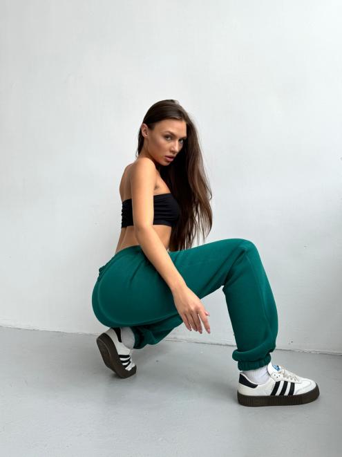 Брюки женские из футера трехнитка с начесом Сова изумруд макси