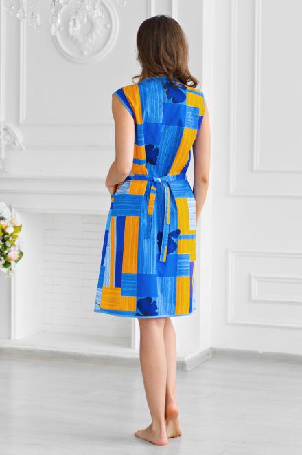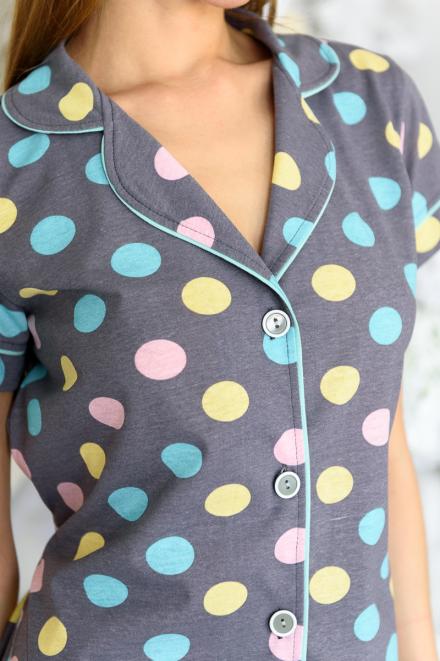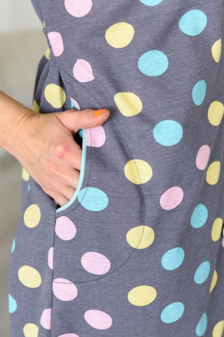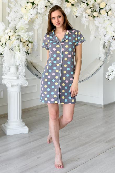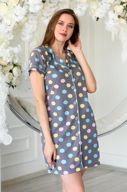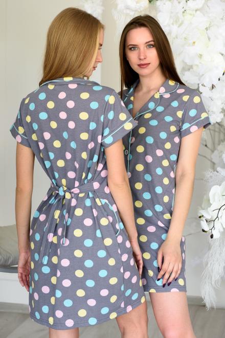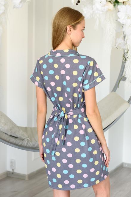 Халат женский из кулирки с коротким рукавом и кантом Саманта цветной горох на сером